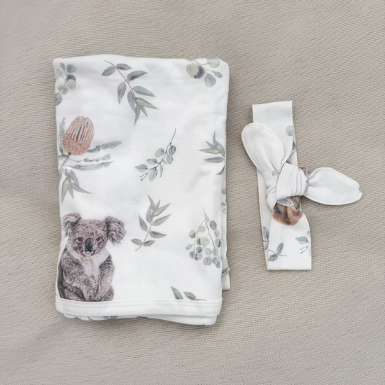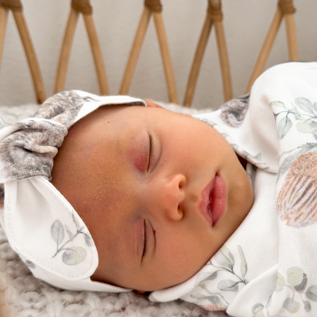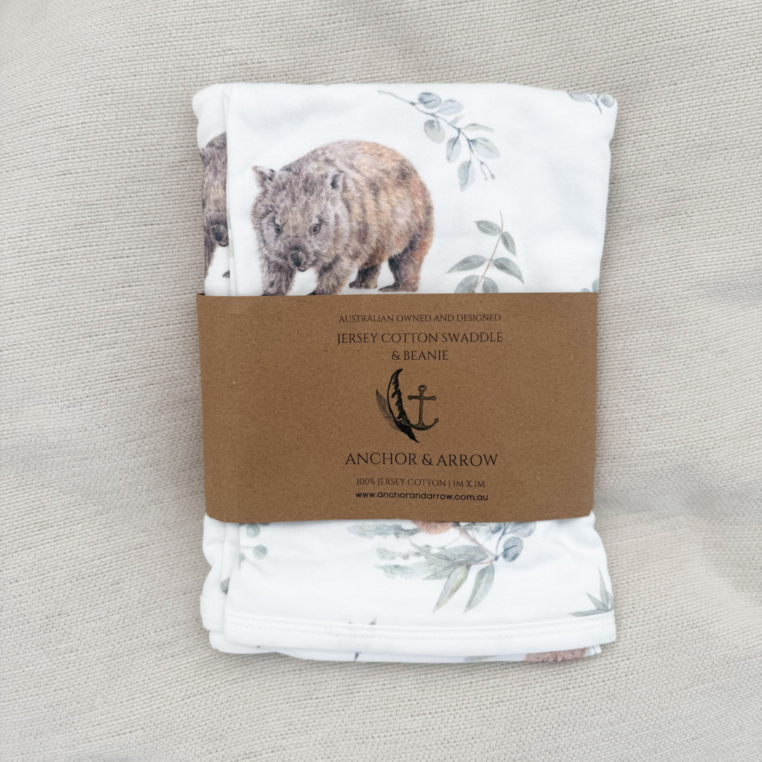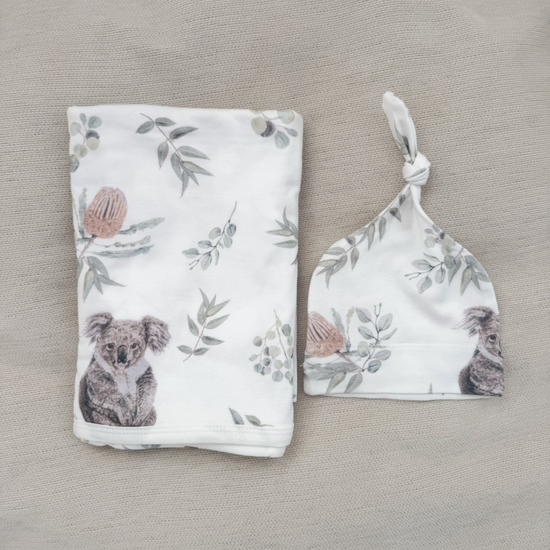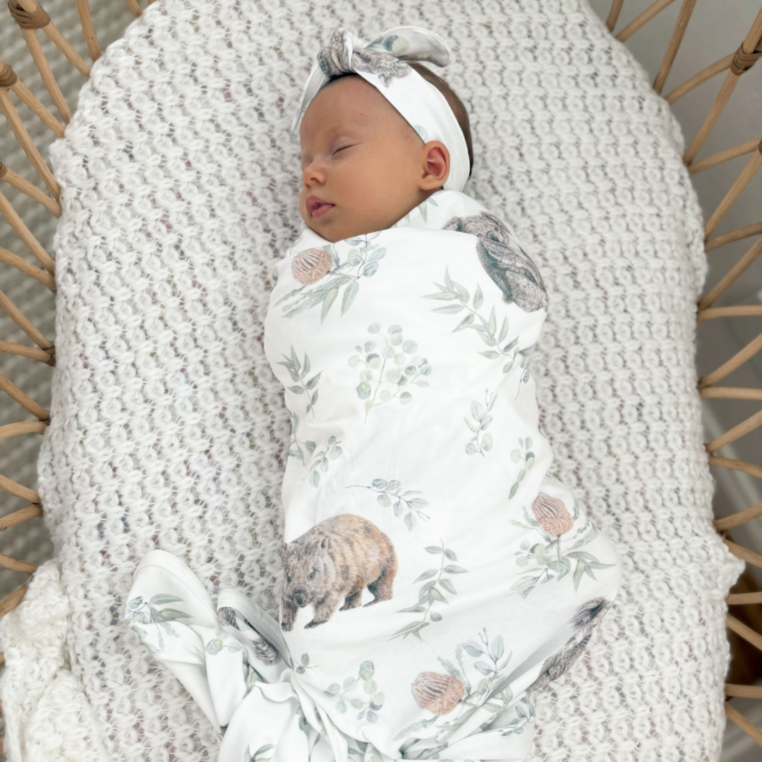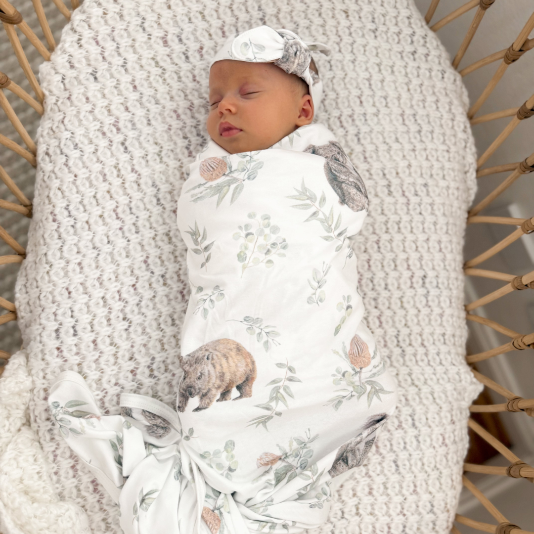 Our gorgeous Australiana print is the perfect gender neutral print. Designed with soft Australian animals and iconic leaves, this swaddle has quickly become a favourite in our collection and is now available in our Jersey swaddle and matching beanie.