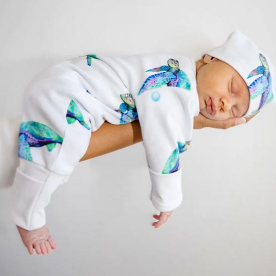 To complete the look with our best selling Sea Turtle print, this hand-painted design is available in a cute beanie.