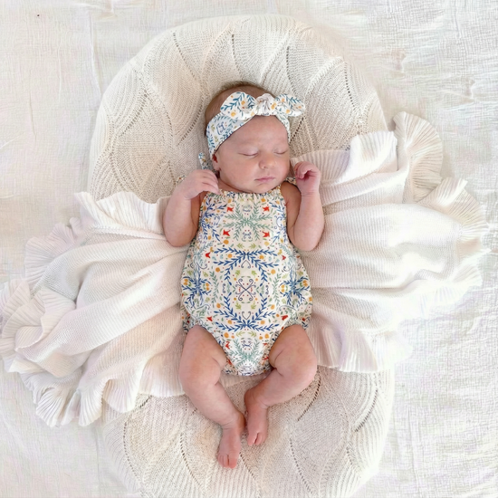 To complete the look with our gorgeous swaddle, this design is also available in a matching headband or beanie.