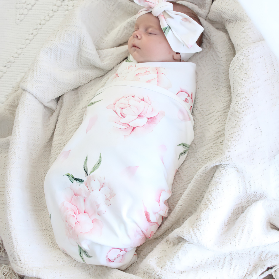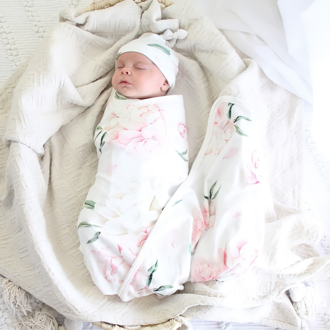 Our super-soft jersey swaddle and beanie set in our pretty peony design.
